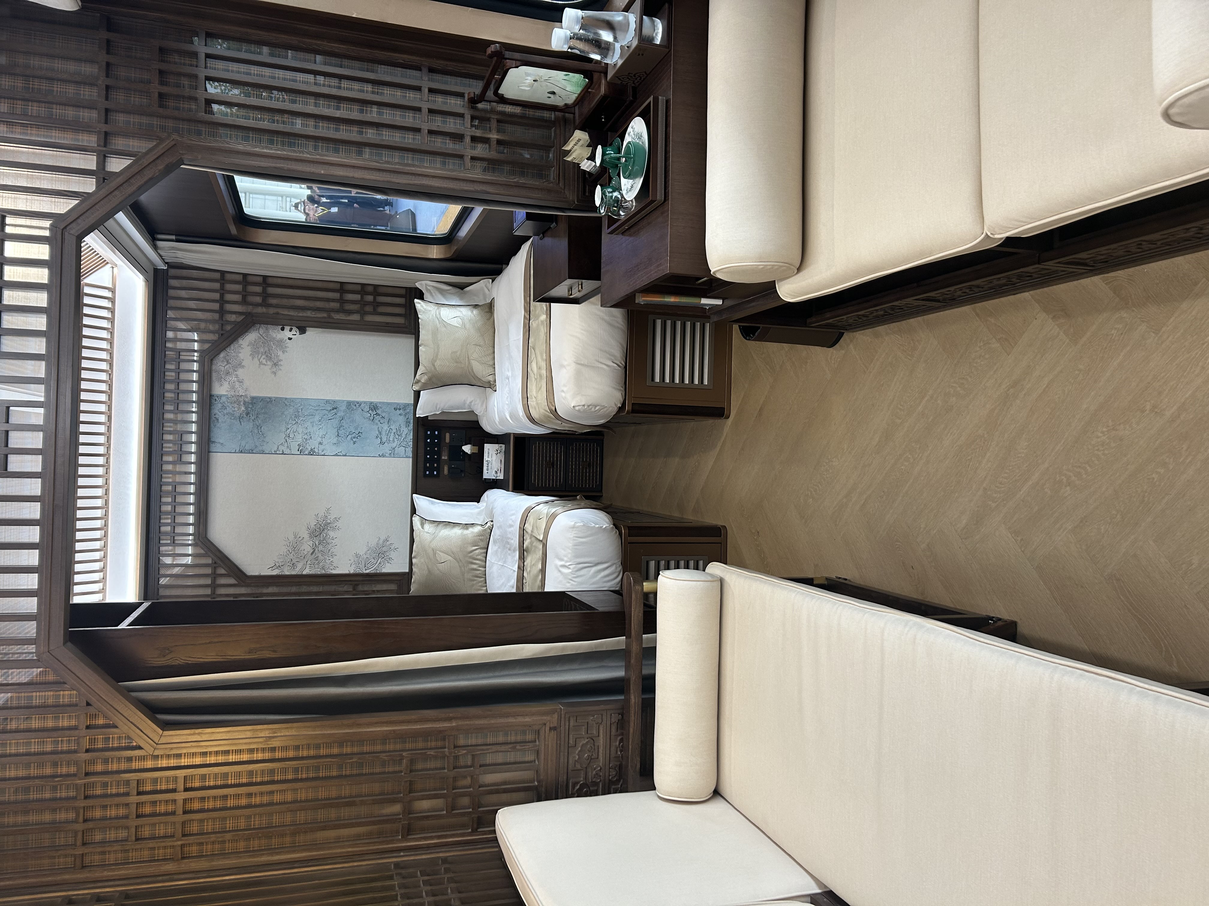 “熊猫专列·锦绣天府号”上共有46间客房,均为双床房,包含2节“锦榻”奢享房型车厢和10节“锦卧”品质房型车厢。奢享房比品质房大3平方米,增加了两个长沙发(会客区)。
