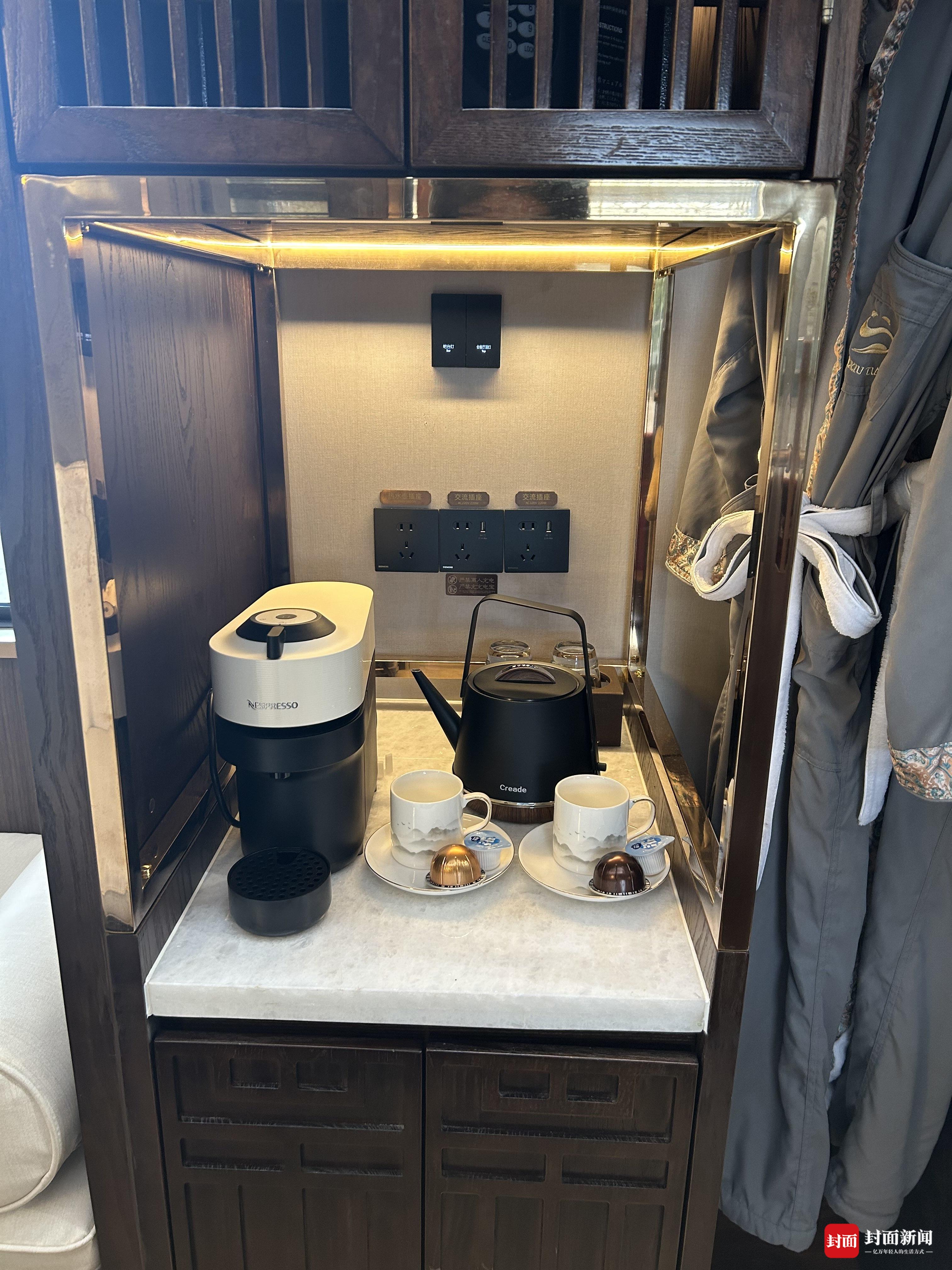 记者注意到,客房需要刷卡进入,跟酒店住宿相似。房间里配备了茶水吧和小冰箱,奢享房里还有胶囊咖啡机;房内均有干湿分离的卫浴间,免费提供浴袍。